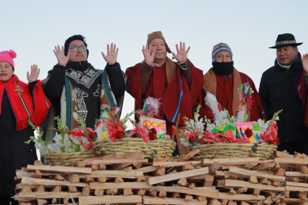 El presidente Luis Arce y el vicepresidente David Choquehuanca participaron la madrugada de este sábado en la ceremonia ancestral del Año Nuevo Andino Amazónico y del Chaco 5533, en el templo arqueológico de Tiahuanacu, donde se llevó a cabo el tradicional ritual del Willka Kuti o “retorno del sol”.