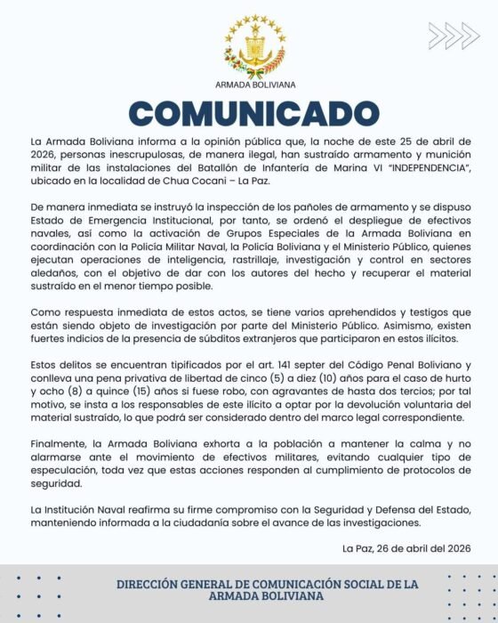 Mediante un comunicado oficial, la Armada Boliviana informó sobre la sustracción de armamento y munición militar desde las instalaciones del Batallón de Infantería de Marina VI “Independencia”, ubicado en la localidad de Chua Cocani, en el departamento de La Paz. El hecho se registró la noche del 25 de abril de 2026.