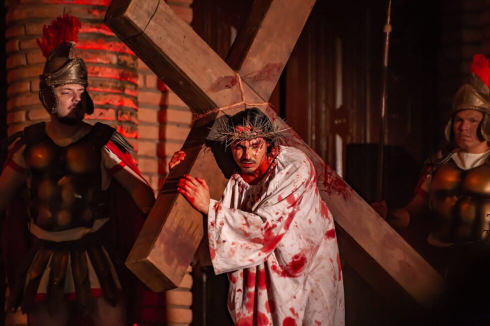 La Arquidiócesis de Santa Cruz presentó este año la obra teatral “El Calvario”, una propuesta innovadora de Diego Paesano, quien no solo la dirige y produce, sino que también interpreta a Jesús. La puesta en escena se realiza con el elenco de Alquimia Producciones y forma parte de las actividades centrales de Semana Santa en la ciudad.