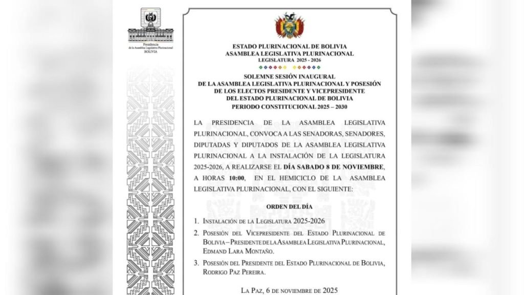 La Presidencia de la Asamblea Legislativa Plurinacional de Bolivia emitió una convocatoria oficial dirigida a senadores y diputados para participar en la sesión inaugural de la Legislatura 2025–2026, en la que se realizará la posesión del presidente y vicepresidente electos del Estado Plurinacional de Bolivia.