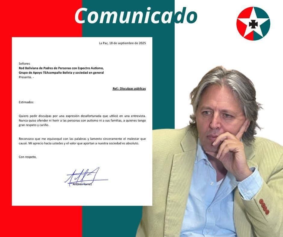 En una carta dirigida a la Red Boliviana de Padres de Personas con Espectro Autista, al grupo de apoyo TEAcompañ@ Bolivia y a la sociedad en general, Torres manifestó su arrepentimiento y aseguró que su intención “nunca fue ofender ni herir los sentimientos” de las personas con autismo ni de sus familias.