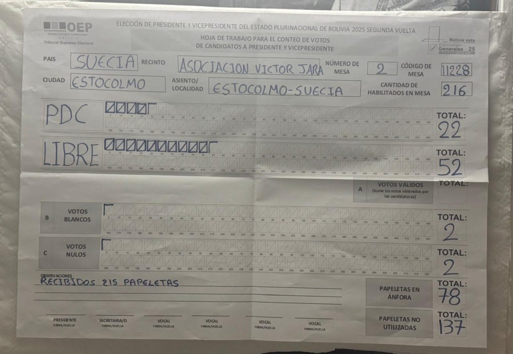 Estocolmo, Suecia – La Alianza Libre (LIBRE) volvió a imponerse sobre el Partido Demócrata Cristiano (PDC) en la votación de los bolivianos residentes en Suecia, reafirmando el respaldo de la comunidad al frente liderado por Jorge Tuto Quiroga.