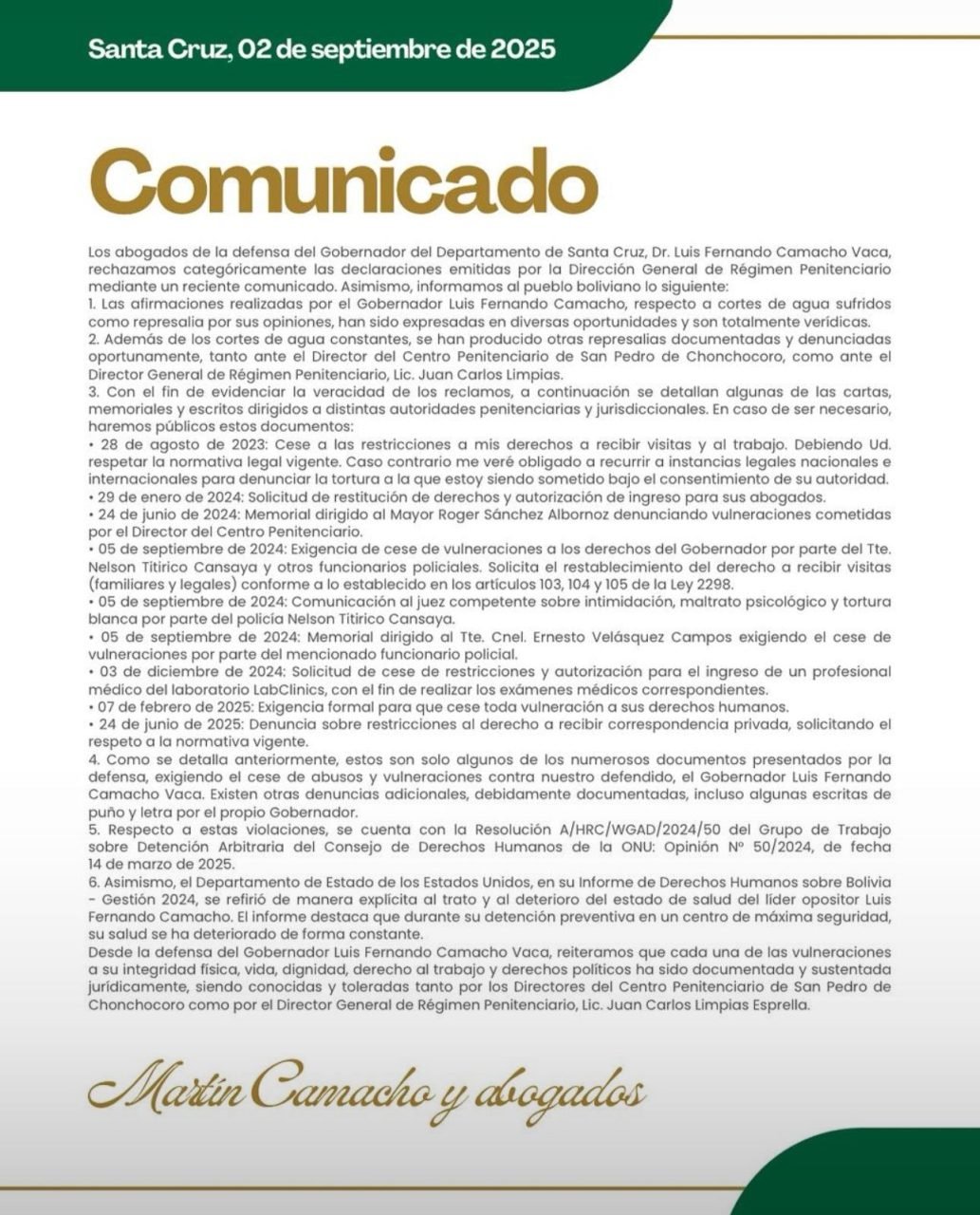 “El Estado boliviano tiene pleno conocimiento de cada abuso cometido contra el gobernador Camacho. Todo ha sido registrado y notificado a los directores del penal”, afirmó el equipo legal, reiterando su compromiso de continuar denunciando y exigiendo el cese inmediato de las vulneraciones a los derechos humanos del líder opositor.