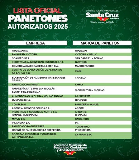 El jefe del departamento, Pedro Galarza, indicó que en Santa Cruz hay 20 empresas autorizadas para producir y comercializar panetones, todas con los permisos y registros sanitarios vigentes. Entre las marcas destacan: