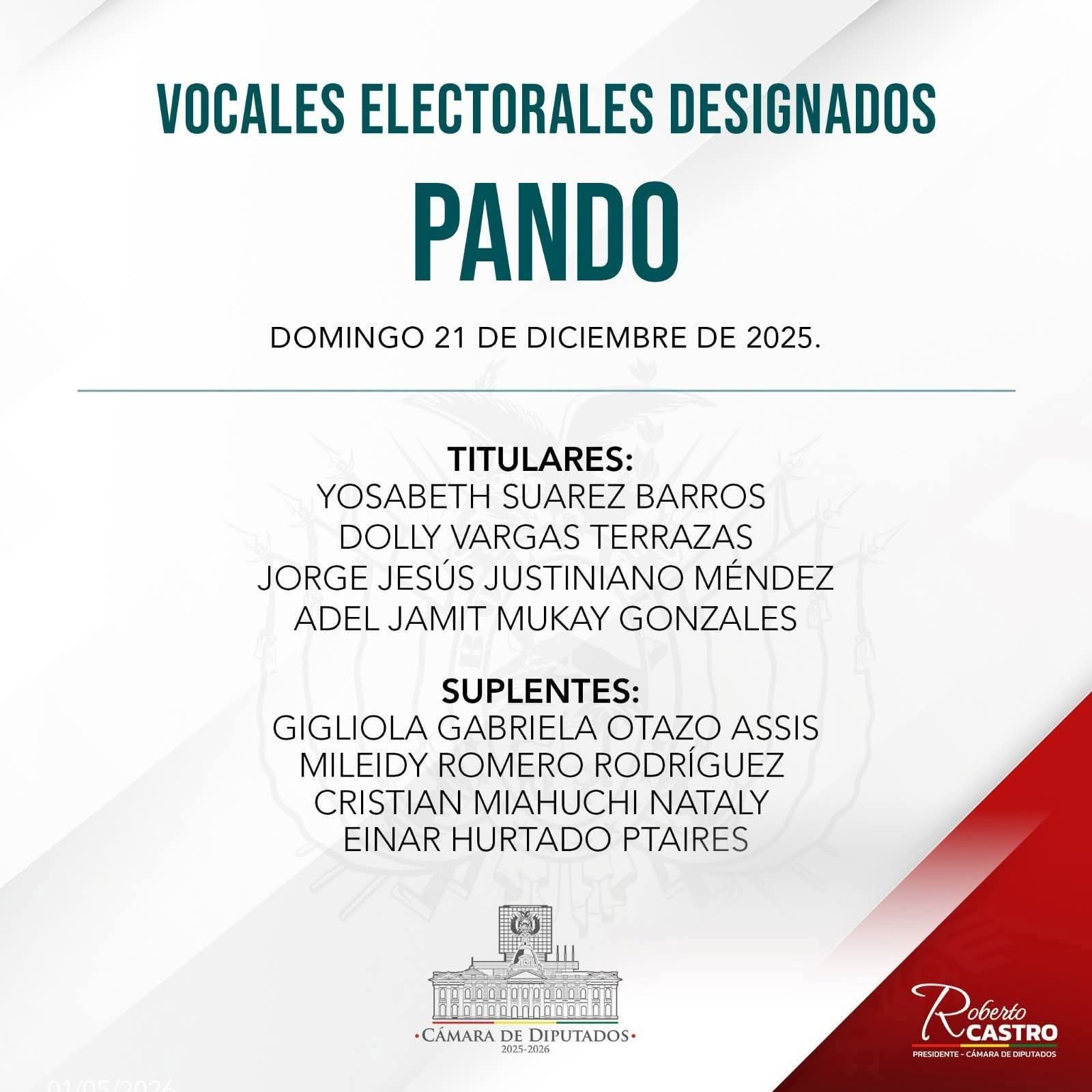 La Cámara de Diputados eligió este domingo a los cuatro vocales titulares del Tribunal Electoral Departamental (TED) de Pando, logrando el apoyo de al menos dos tercios de los legisladores presentes.