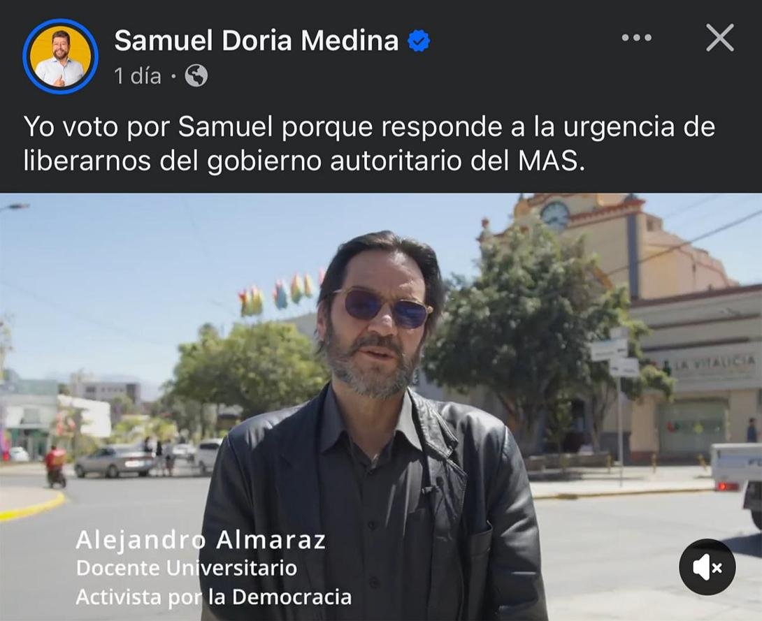 Alejandro Almaraz, abogado, docente universitario y exautoridad del gobierno de Evo Morales, argumentó su decisión de votar por Doria Medina por dos razones. Primero, “la urgencia que compartimos la gran mayoría de los bolivianos de librarnos del gobierno autoritario del MAS” y la necesidad de concentrar el voto en el candidato mejor posicionado. Segundo, la percepción de “menos riesgos de regresión en logros” del proceso de cambio, especialmente en el plano formal, como la Constitución Política del Estado.