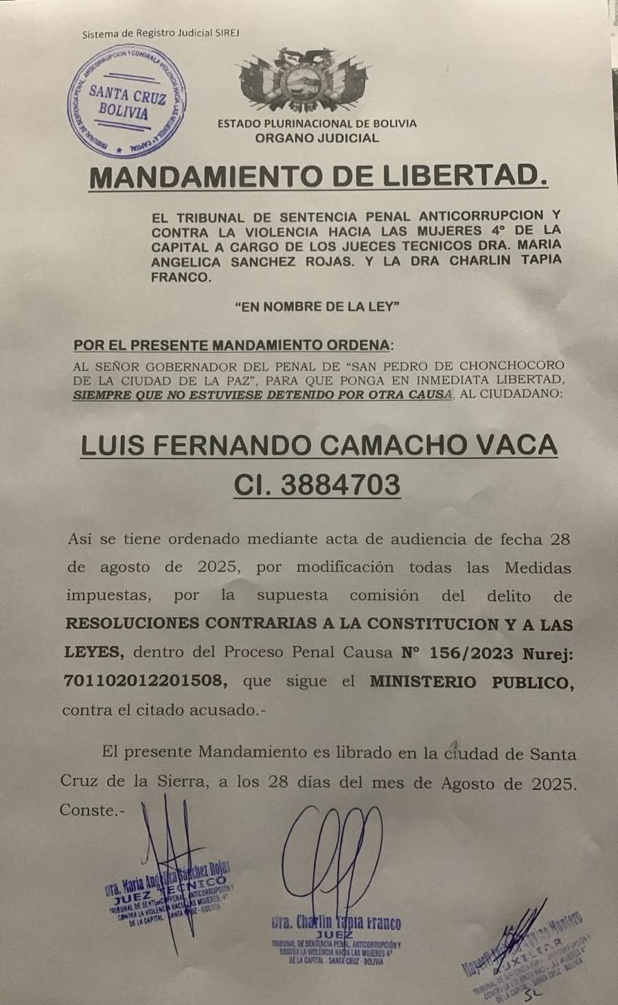 El Tribunal de Sentencia Penal Cuarto de Anticorrupción y Contra la Violencia hacia la Mujer de Santa Cruz emitió un mandamiento de libertad en favor del gobernador Luis Fernando Camacho, en el marco del proceso judicial conocido como Caso Decretazo.