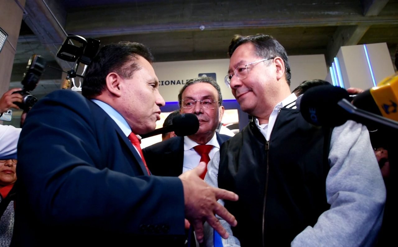El presidente Luis Arce Catacora felicitó al presidente del Servicio de Impuestos Nacionales (SIN) por la implementación del Sistema Integrado de la Administración Tributaria (SIAT en Línea), durante su visita al espacio de exposición de esta institución estatal en la octava versión de La Paz Expone 2025, en el Bloque Rojo del Campo Ferial Chuquiago Marka.
