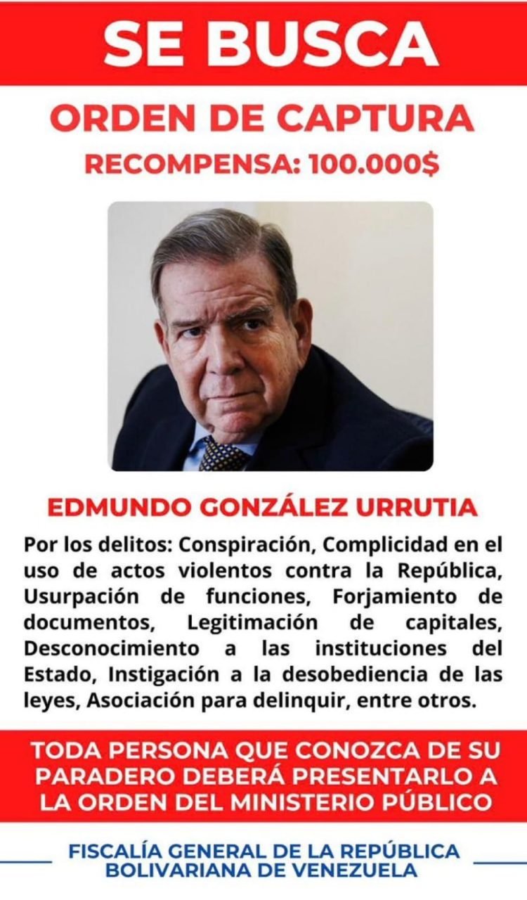 La Fiscalía de Venezuela lanzó este jueves una recompensa por USD 100.000 por información sobre el paradero del opositor Edmundo González Urrutia, quien abandonó el país en septiembre y se exilió a España, ante la intensa persecución por parte del régimen de Nicolás Maduro.Las autoridades chavistas acusan al opositor de los delitos de conspiración, complicidad en el uso de actos violentos contra la República, usurpación de funciones, forjamiento de documentos, legitimación de capitales, desconocimiento a las instituciones del Estado, instigación a la desobediencia de las leyes y asociación para delinquir, entre otros, y apuntan por tanto que “toda persona que conozca de su paradero debería presentarlo a la orden del Ministerio Público”.