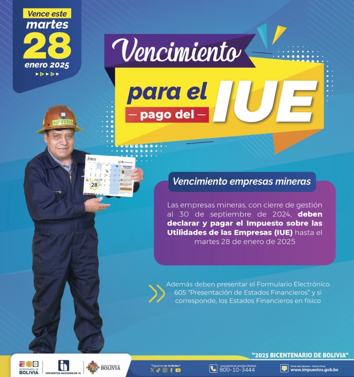 El Servicio de Impuestos Nacionales (SIN) recordó que el vencimiento para la declaración y el pago del Impuesto sobre las Utilidades de las Empresas (IUE) para el sector minero, con cierre de gestión fiscal al 30 de septiembre de 2024, vence impostergablemente el martes 28 de enero de 2025.