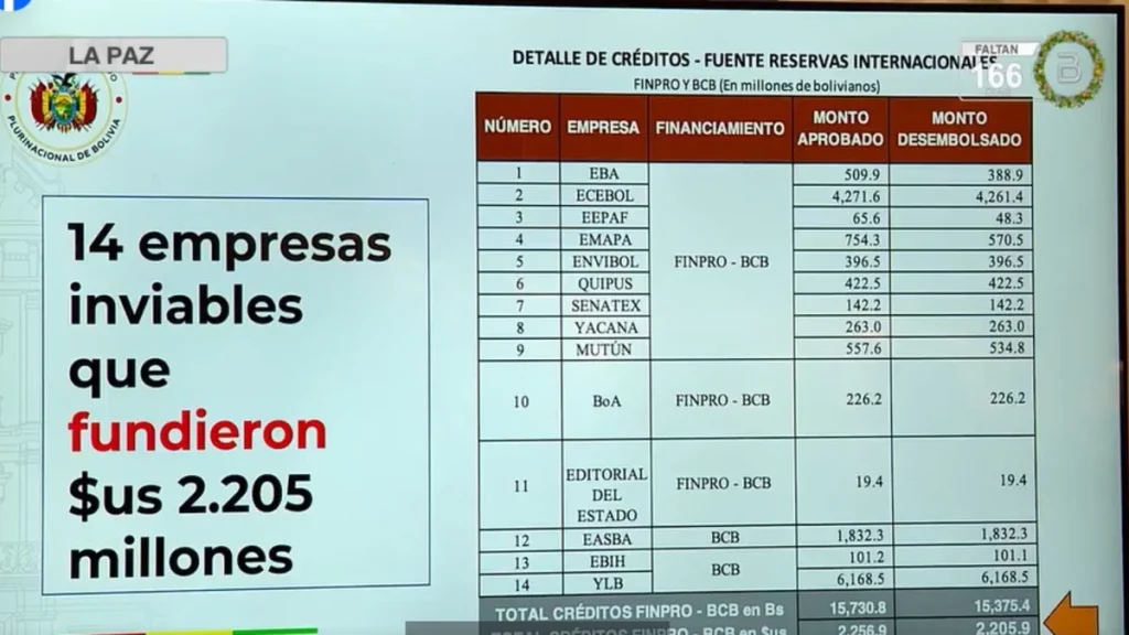 El ministro detalló que 14 empresas resultaron inviables, recibiendo el 28% de los recursos y convirtiéndose en focos de corrupción. Entre estas firmas se encuentran EBA, Emapa, Quipus, Mutún, BoA, EHIH y YLB, cuatro de ellas ya cerradas y cinco en quiebra técnica.