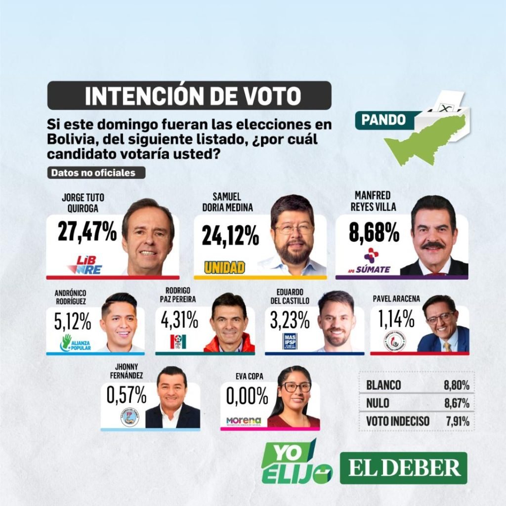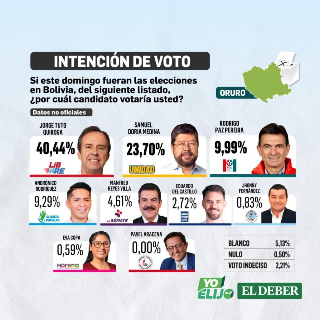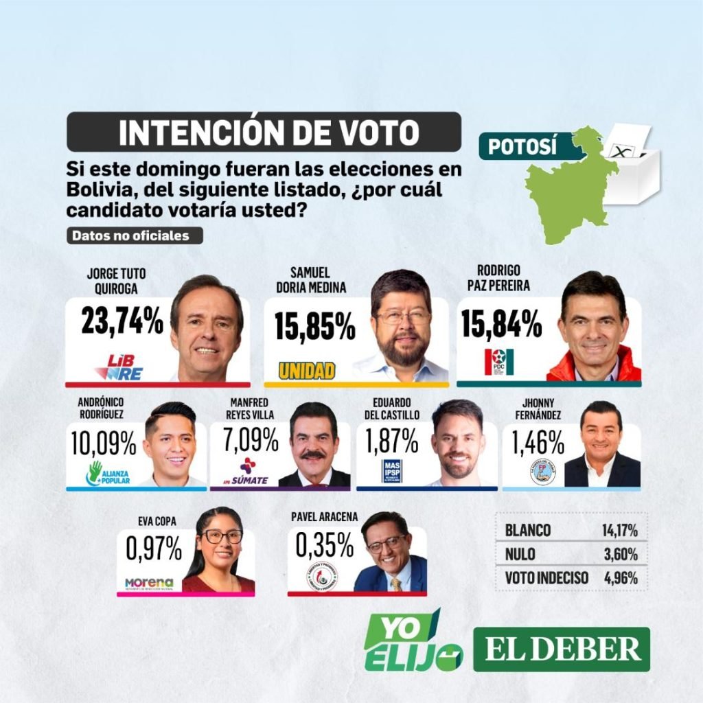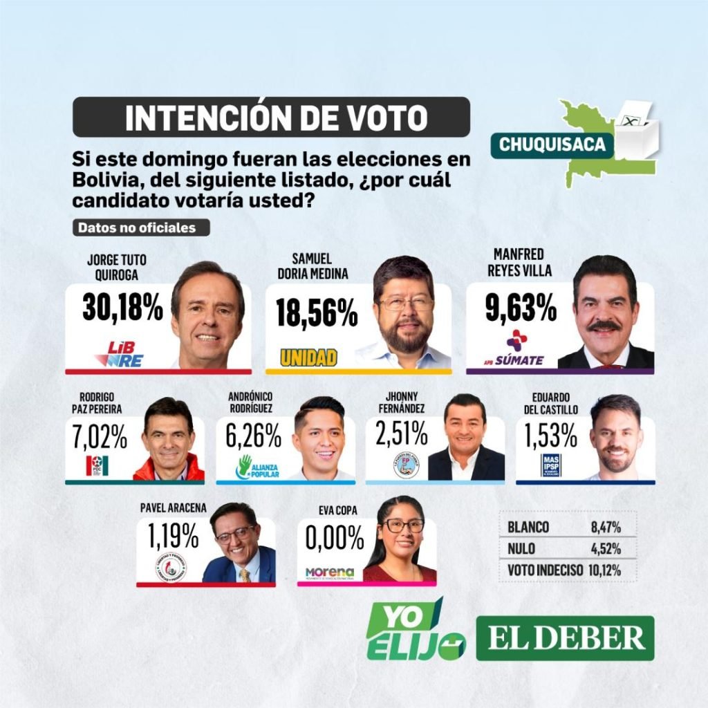 La cuarta encuesta nacional de intención de voto elaborada por SPIE Consulting SRL para el Grupo EL DEBER reveló un nuevo giro en la preferencia de votos en los departamentos de: Oruro, Chuquisaca, Potosí y Cochabamba, donde el candidato de Libre, Jorge Tuto Quiroga, saca una significativa diferencia a Samuel Doria Medina, de la alianza Unidad.