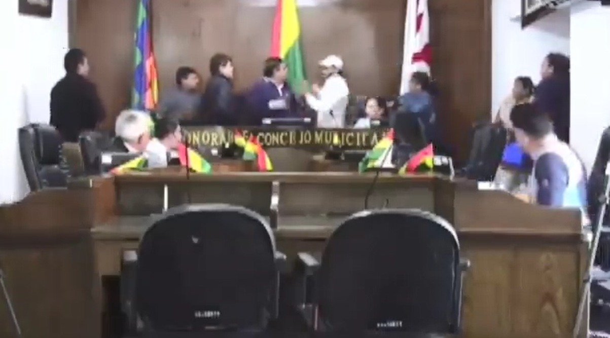 Durante una acalorada sesión del Concejo Municipal de Sucre, se registró un tenso altercado entre los concejales Óscar Sandy y Rodolfo Avilés, ambos del Movimiento Al Socialismo (MAS). El intercambio subió de tono hasta derivar en enfrentamientos verbales y físicos, reflejando la tensión interna que atraviesa el partido, afectando el desarrollo del debate democrático en la capital.