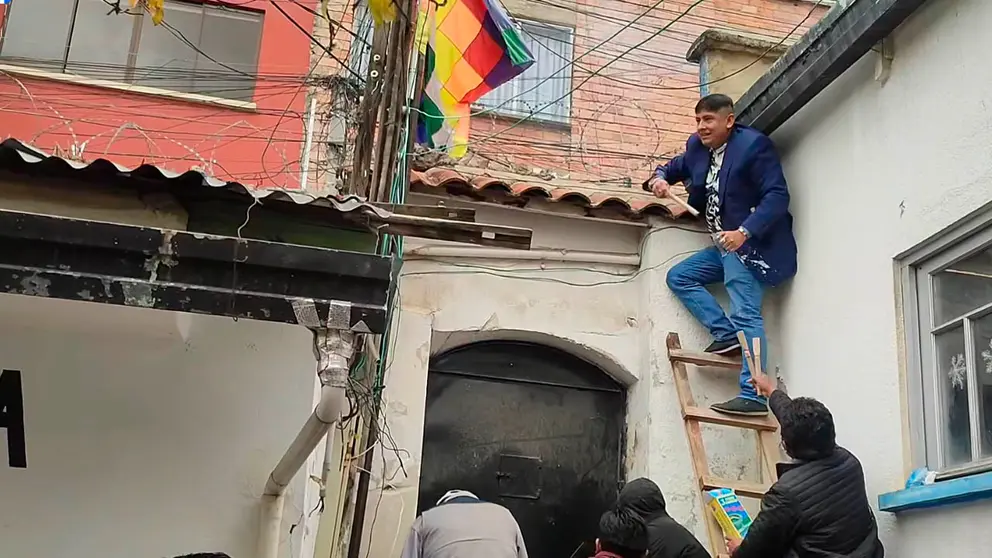 La toma había sido liderada por el diputado Rolando Cuéllar. Los “arcistas” usaron una escalera para trepar la pared y lograr ingresar al predio, donde procedieron a borrar las imágenes de Evo Morales.