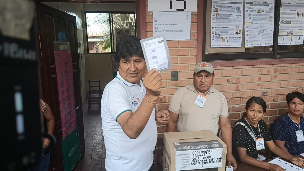 El expresidente Evo Morales Ayma acudió esta mañana al centro de votación Villa-14 de septiembre, en el Trópico de Cochabamba, para emitir su voto durante la segunda vuelta electoral. Morales llegó acompañado de un resguardo y depositó su sufragio.