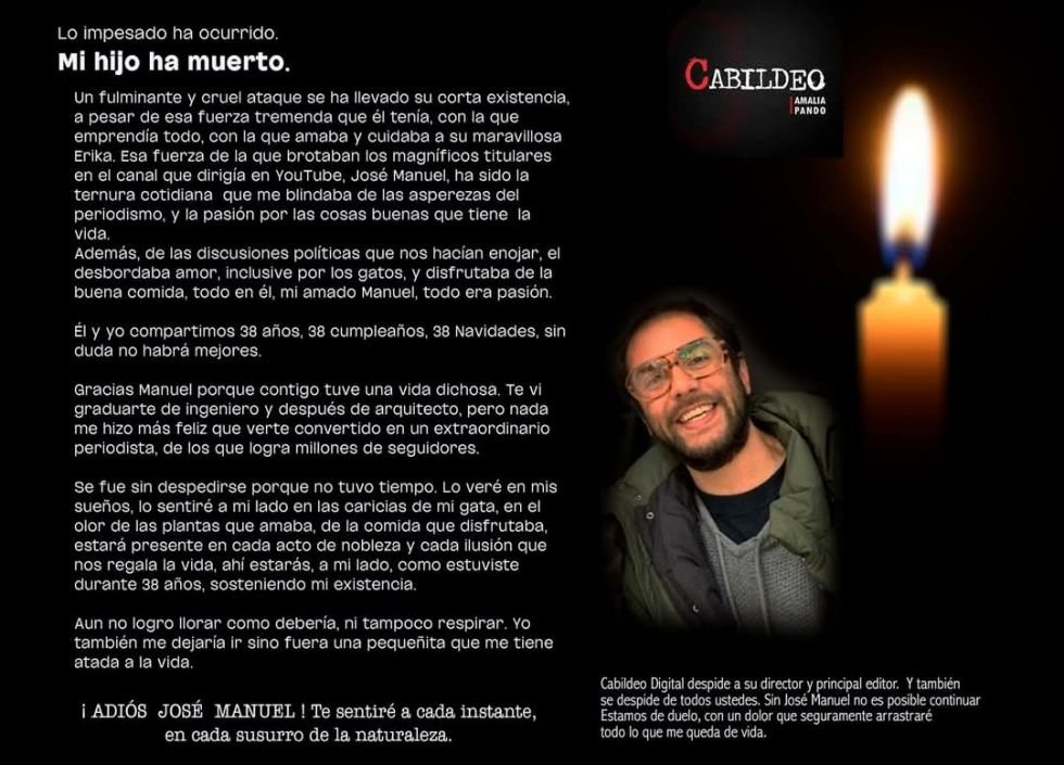 “Lo impensado ha ocurrido. Mi hijo ha muerto. Un fulminante y cruel ataque se ha llevado su corta existencia, a pesar de esa fuerza tremenda que él tenía, con la que emprendía todo, con la que amaba y cuidaba a su maravillosa Erika, esa fuerza de la que brotaban los magníficos titulares en el canal que dirigía en YouTube”, escribió.