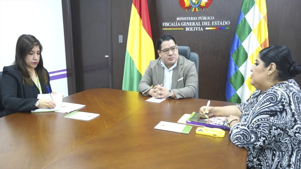 El Fiscal General del Estado, Roger Mariaca Montenegro, sostuvo una reunión de coordinación con la Viceministra de Igualdad de Oportunidades, Descolonización y Despatriarcalización, Jessica Echeverría, con el objetivo de articular acciones conjuntas orientadas a la reglamentación de la Ley N° 1636 “Para la Protección de la Integridad Sexual de Niñas, Niños y Adolescentes”, norma fundamental para el resguardo de los derechos de la niñez y adolescencia en el país.