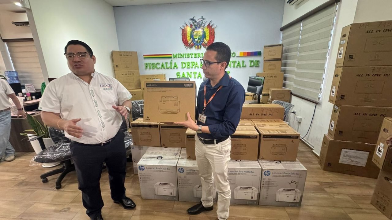 El Fiscal General del Estado, Roger Mariaca Montenegro, entregó a la Fiscalía Departamental de Santa Cruz, 90 equipos tecnológicos consistentes en computadoras de última generación, impresoras y scanner, además de escritorios, sillones semi ejecutivos y estantes metálicos para que sean distribuidos, de acuerdo a las necesidades, en cada dependencia del Ministerio Público de esa región, contribuyendo a mejorar los servicios que se otorga a las víctimas y al público litigante.