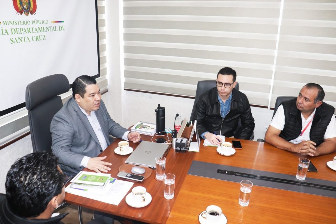 El Fiscal General del Estado, Roger Mariaca Montenegro, sostuvo una reunión interinstitucional de coordinación con representantes de sectores productivos, ganaderos y la Autoridad de Fiscalización y Control Social de Bosques y Tierra (ABT), con el objetivo de articular acciones concretas y efectivas para luchar contra los delitos de Incendio, Avasallamiento y Abigeato en el departamento de Santa Cruz.