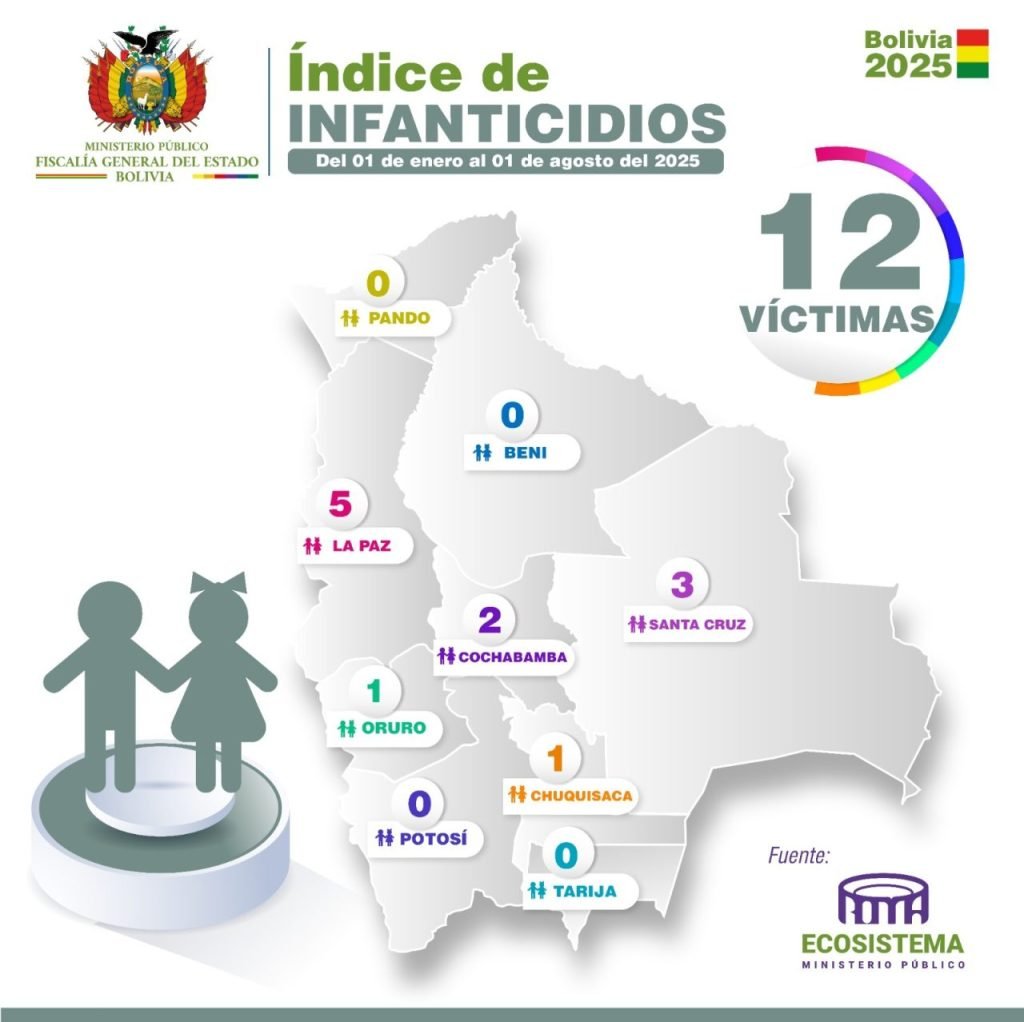En relación con los casos de Infanticidio, hasta el momento se registran 11 casos con 12 víctimas. La mayor parte de las víctimas se concentra en el departamento de La Paz con 5, seguido por Santa Cruz con 3, Cochabamba con 2, Oruro con 1 y Chuquisaca con 1.