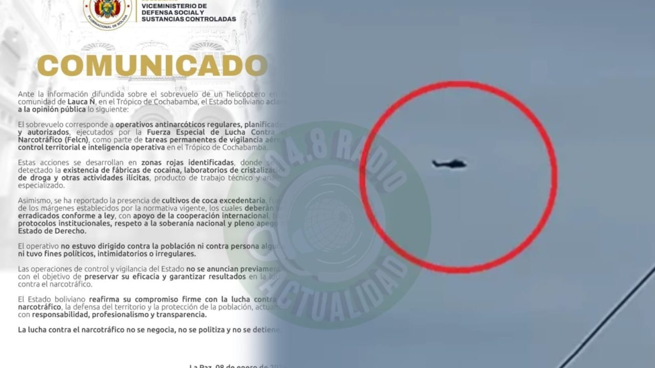 Mediante un comunicado oficial, el Ministerio de Gobierno informó que el sobrevuelo de un helicóptero en la comunidad de Lauca Ñ, en el Trópico de Cochabamba, según un reporte del Viceministerio de Defensa Social y Sustancias Controladas, parte de tareas permanentes de vigilancia aérea, control territorial e inteligencia operativa en el trópico de Cochabamba.