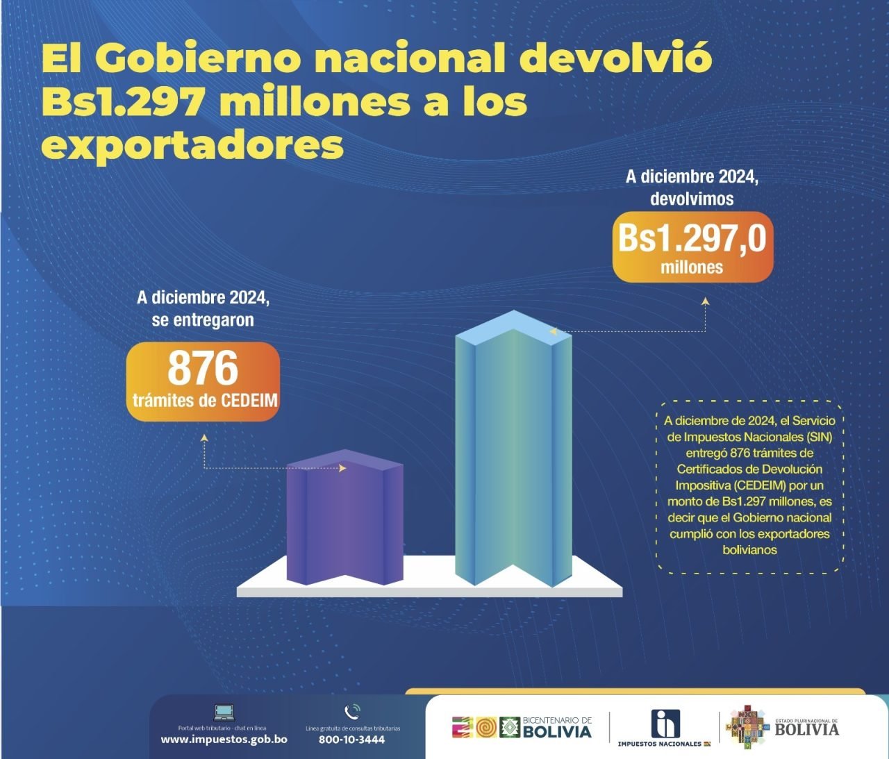 En el marco de la normativa tributaria vigente, el Gobierno nacional mediante el Servicio de Impuestos Nacionales (SIN) cumplió con el sector exportador boliviano al devolverle un total de Bs1.297 millones mediante la entrega de 876 Certificados de Devolución Impositiva (CEDEIM), hasta diciembre de 2024.
