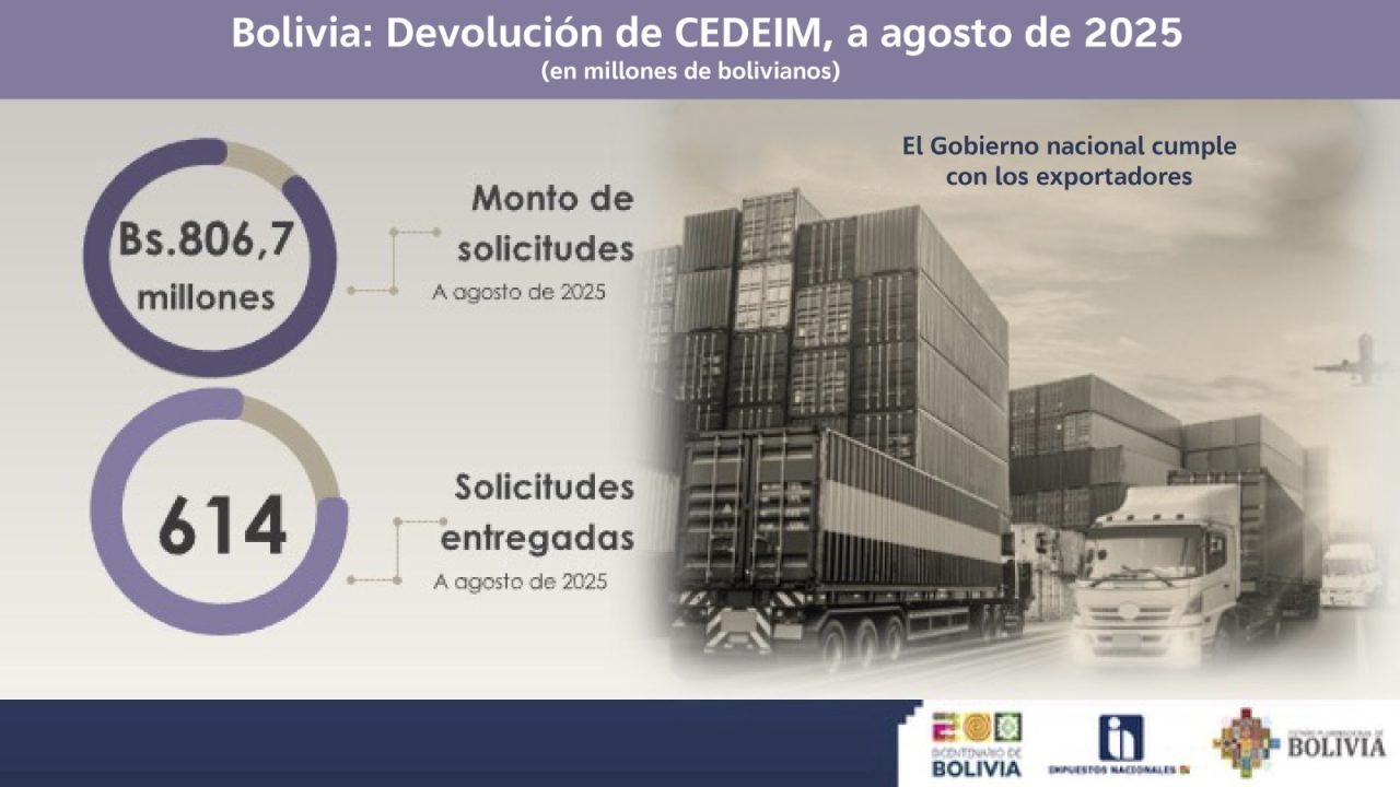 El Gobierno nacional, mediante el Servicio de Impuestos Nacionales (SIN), devolvió al sector exportador boliviano un total de Bs806,7 millones a través de la entrega de 614 Certificados de Devolución Impositiva (CEDEIM), hasta agosto de 2024.