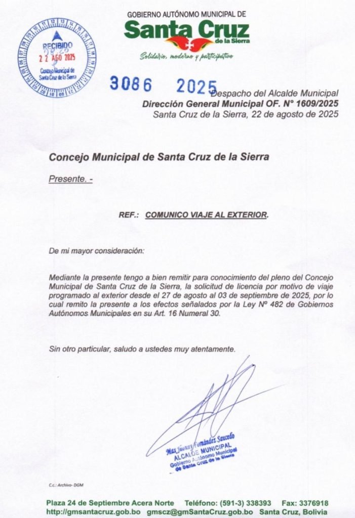 El alcalde de Santa Cruz de la Sierra, Jhonny Fernández, notificó este viernes al Concejo Municipal sobre la reprogramación de su viaje al exterior. Inicialmente, el viaje estaba previsto del 23 al 30 de agosto; sin embargo, en una nueva solicitud pidió licencia para ausentarse del 27 de agosto al 3 de septiembre, en cumplimiento de la Ley N° 482 de Gobiernos Autónomos Municipales.