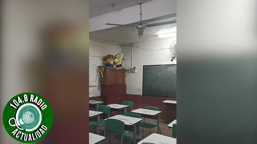 Lamentable la situación del aula de primero de primaria de la Unidad Educativa Mariscal Sucre C, las goteras han dañado tanto el techo, que “llueve” dentro, en el video se puede ver como el agua cae sobre el ventilador del aula poniendo en riesgo la integridad de los alumnos, a vista y paciencia de las autoridades.