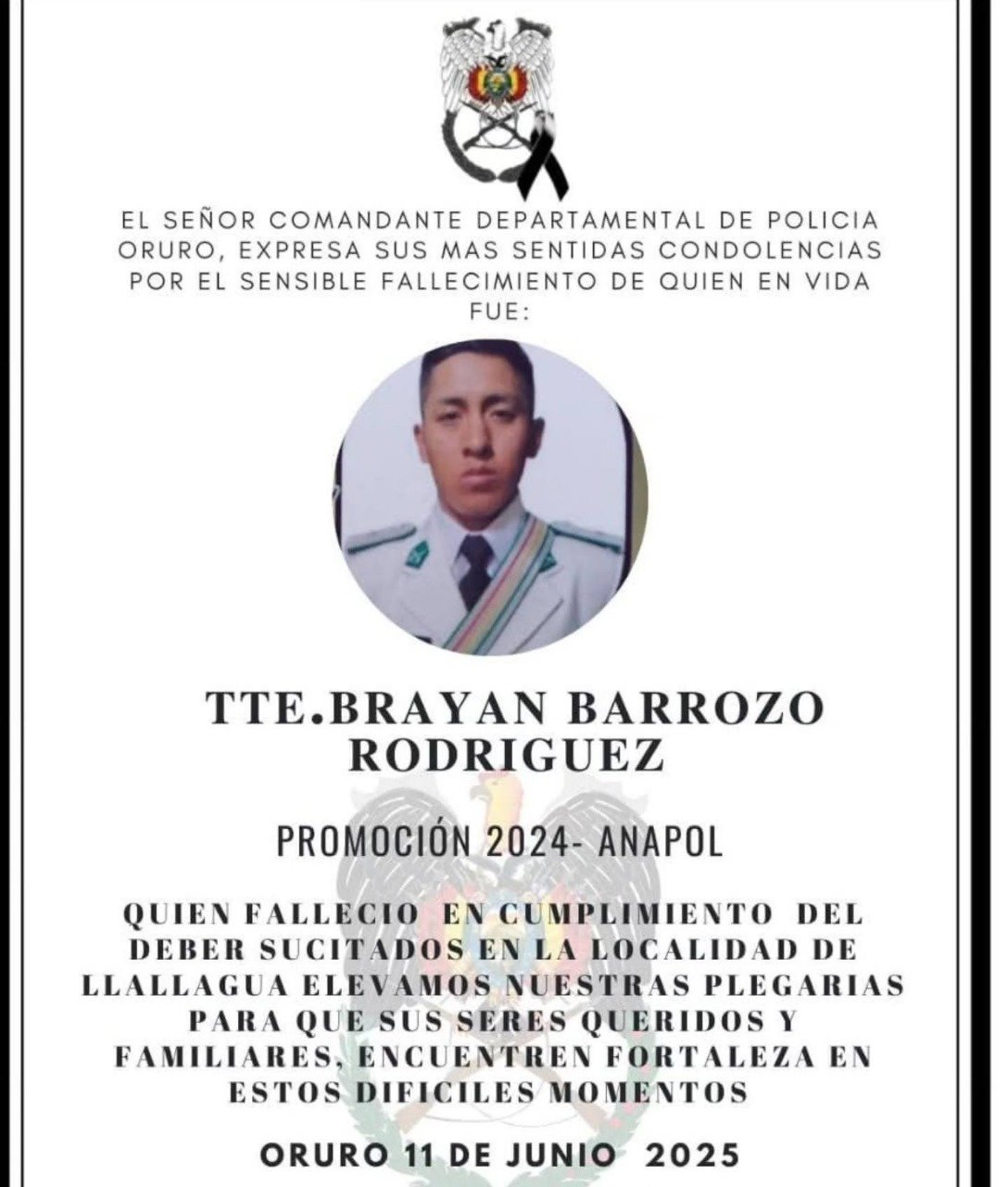 La Policía Departamental de Oruro y el Comando General de la Policia expresaron sus más sentidas condolencias por el fallecimiento del Teniente Brayan Barrozo Rodríguez, perteneciente a la promoción 2024 de la Academia Nacional de Policías (ANAPOL).