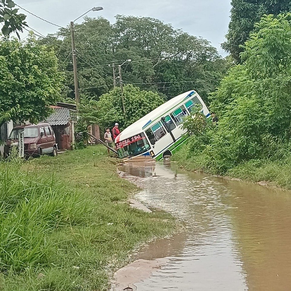 Un conductor que trataba de cruzar un puente terminó encunetado con su micro de la línea 124 en el barrio Las Piedades zona de la avenida Virgen de Luján en la Pampa de la Isla en la ciudad de Santa Cruz.