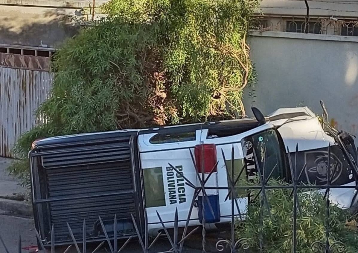 La mañana de este lunes, una patrulla policial protagonizó un accidente en la zona de Sopocachi, en la ciudad de La Paz. El vehículo terminó volcado de costado luego de impactar contra dos árboles a lo largo de una vía del sector.