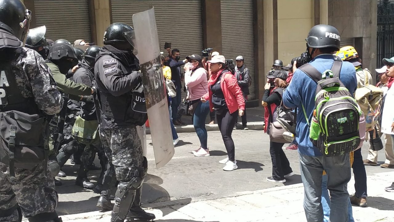 Los incidentes ocurrieron luego de que los docentes intentaran avanzar hacia el edificio gubernamental, lo que provocó la reacción de los uniformados que respondieron con gases lacrimógenos para dispersar a los manifestantes. Imágenes difundidas en redes sociales muestran escenas de tensión, empujones y nubes de gas en la zona.
