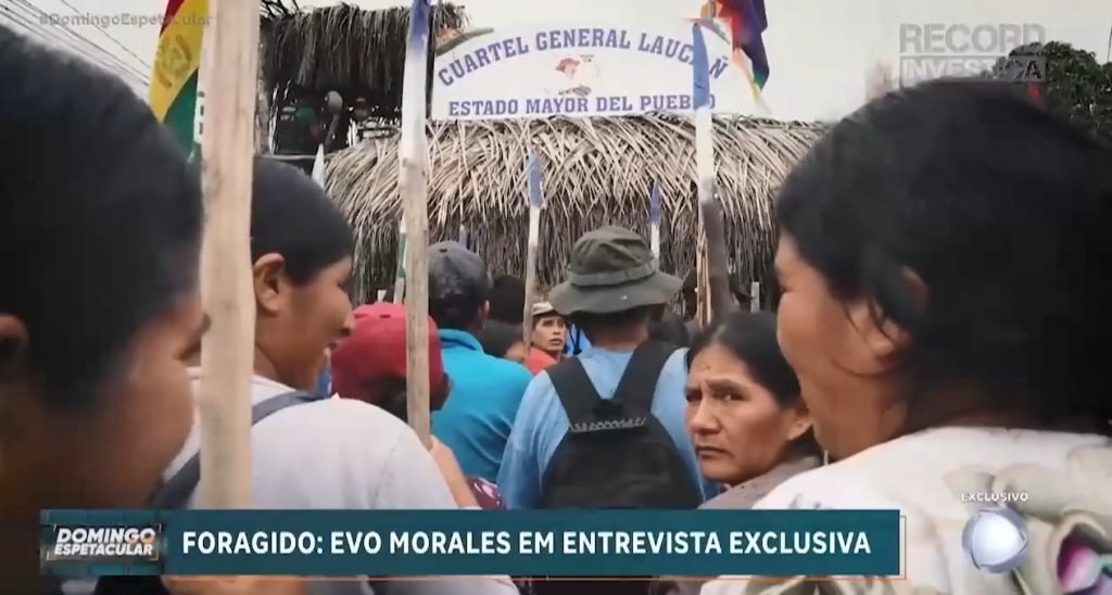 “Evo Morales es un ‘foragido‘ (prófugo, en portugués) y está escoltado por 3.000 civiles armados con lanzas y escudos, una fortaleza al interior de Bolivia (en el Chapare) lo protege”, narra el periodista en la entrevista que se difundió en el programa “Domingo Espectacular” que se difunde en el vecino país.