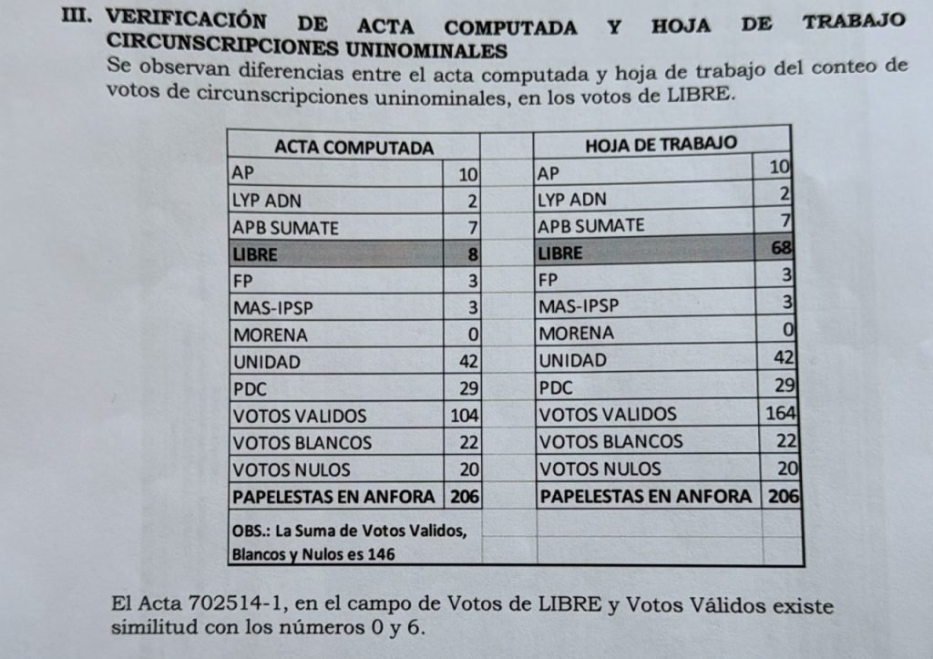La presidenta del TED, María Cristina Claros, aclaró que no se trata de una impugnación formal —cuyo plazo legal de 48 horas ya venció— sino de un pedido de reconsideración técnica, tras detectarse una posible mala validación en una mesa de votación. Este procedimiento, amparado en los principios de transparencia y legalidad, podría tener un efecto directo sobre la asignación del escaño de diputado uninominal.