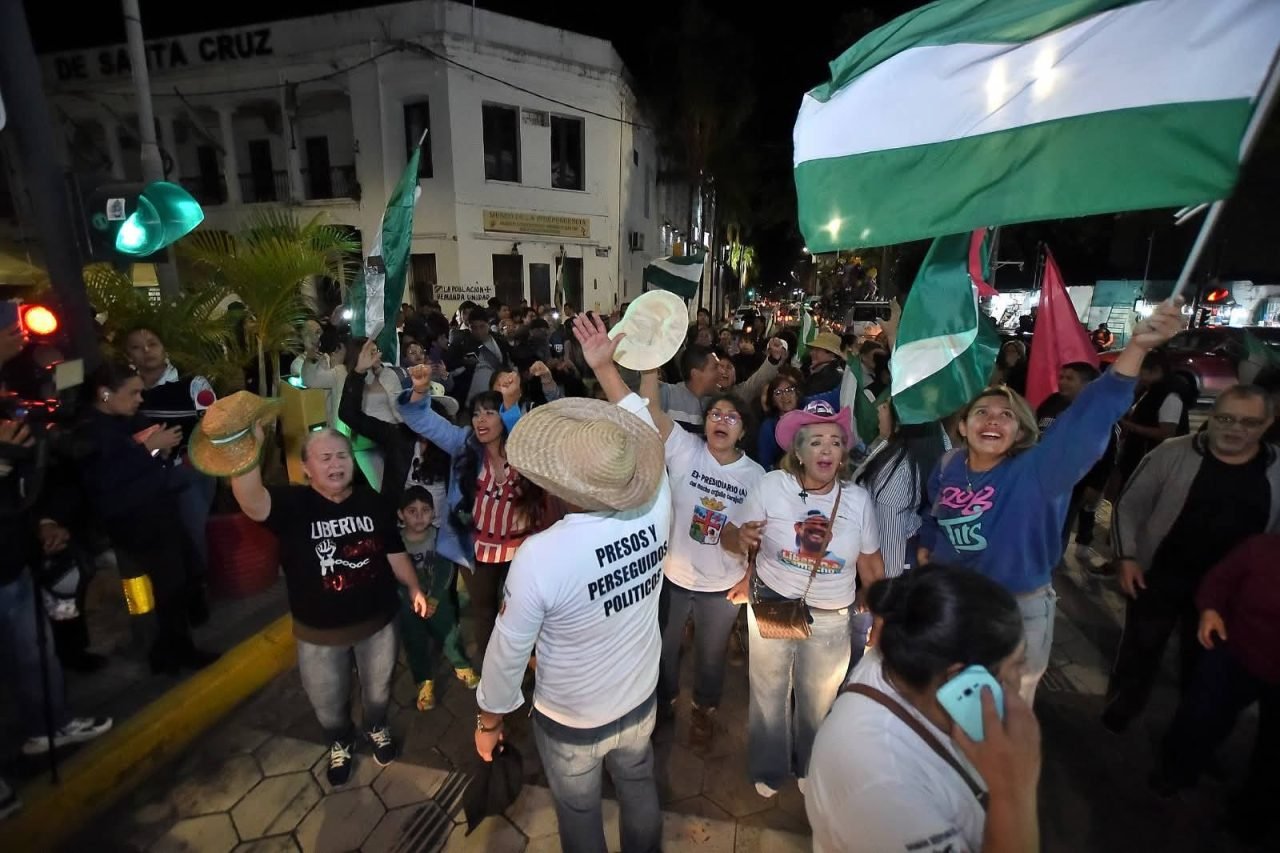 Desde horas de la tarde, cientos de personas comenzaron a congregarse en el centro de la ciudad, portando banderas cruceñas y carteles en apoyo al gobernador. A medida que avanzaba la jornada, la concentración fue tomando un aire festivo. Bandas musicales, bailes espontáneos y fuegos artificiales marcaron el ambiente de celebración, donde la alegría y el alivio fueron evidentes entre los asistentes.