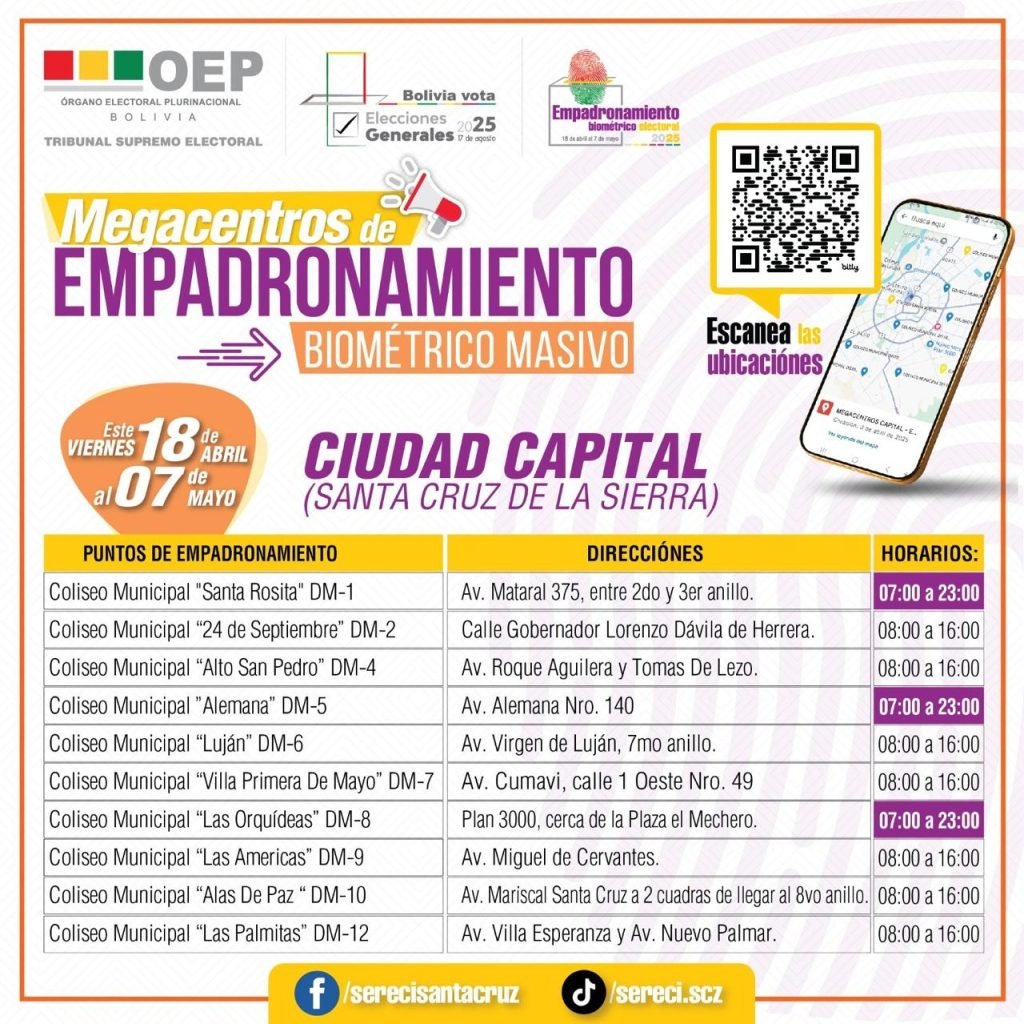Por su parte, el director del Serecí Santa Cruz, Adolfo Freire, resaltó la flexibilidad de los horarios de atención: “Tres megacentros de empadronamiento atenderán en doble turno, de 7:00 a 23:00, y durante los últimos días de registro, el servicio será ininterrumpido (24 horas) en todos los megacentros de la capital”, informó.