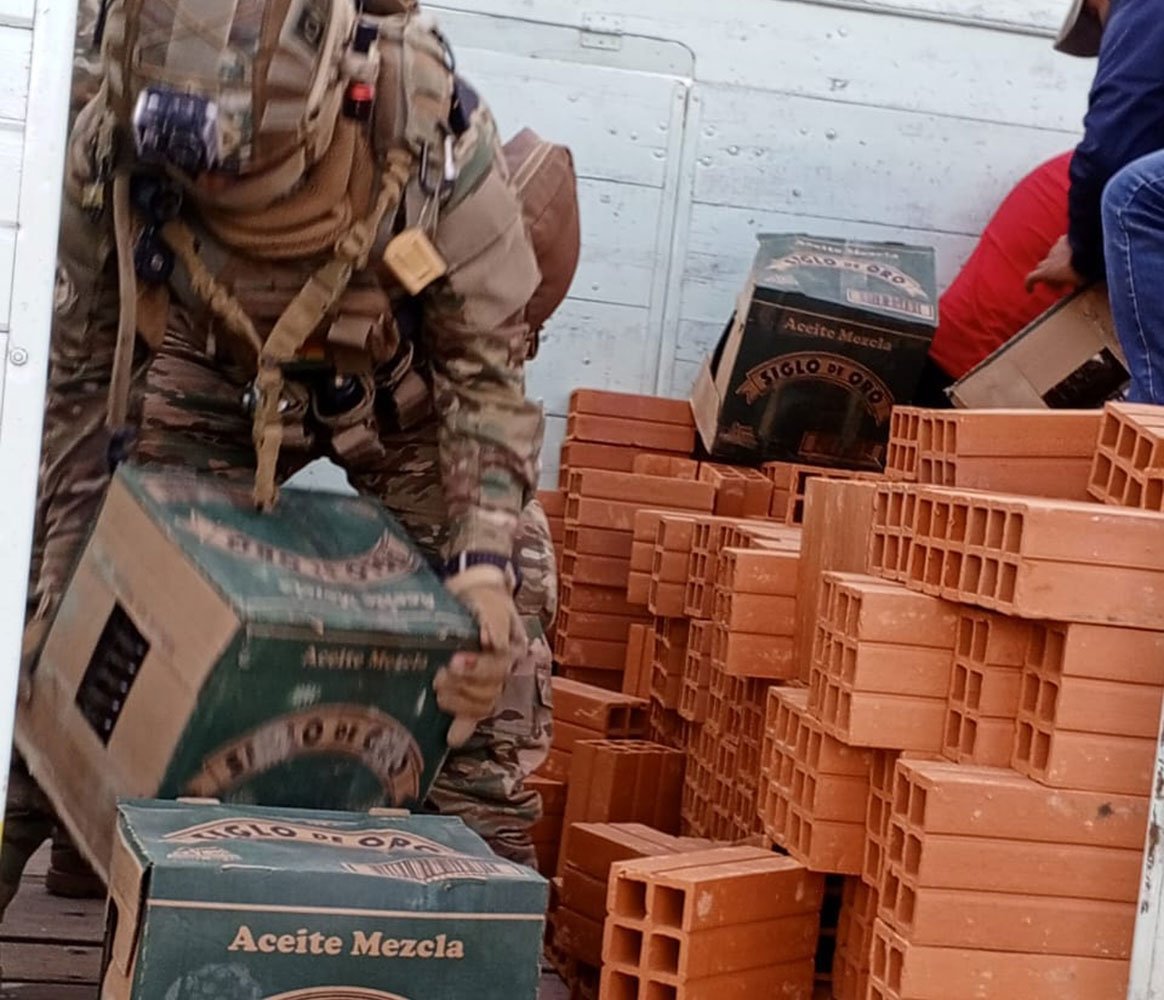 Efectivos militares del Comando Estratégico de Lucha Contra el Contrabando (CEO-LCC) secuestraron en una localidad rural del departamento de La Paz al menos 38 cajas de aceite, en cada caja con cuatro botellas de cinco litros, que se encontraban ocultos entre ladrillos dentro de un camión.