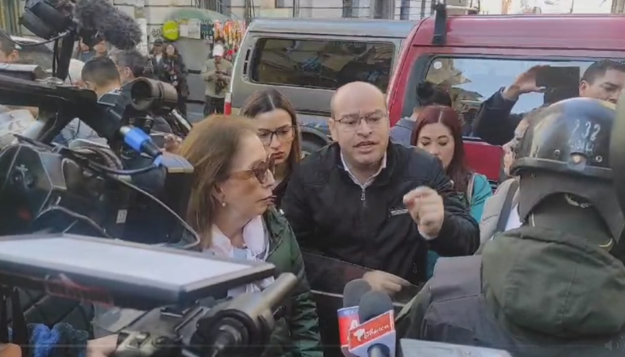 Diputados y senadores de la alianza Creemos, cuyo líder es el gobernador Luis Fernando Camacho, exigían ingresar al salón del Tribunal Primero de Sentencia Anticorrupción que se ubica cerca de la plaza Murillo y la Fuerza Especial de Lucha Contra el Crimen (Felcc).