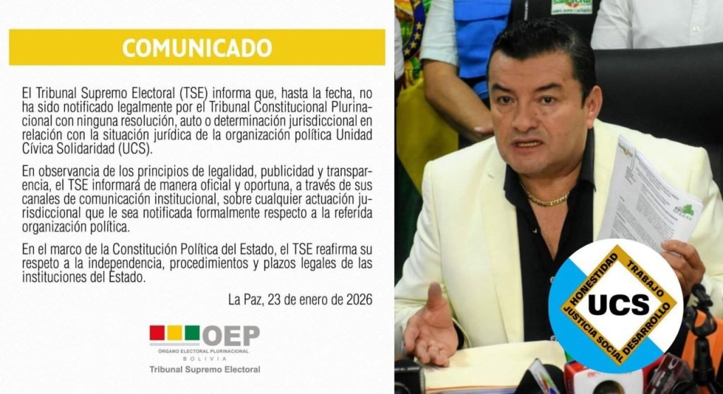Mediante un comunicado institucional, el Órgano Electoral informó que no existe en sus registros ninguna resolución, auto o fallo constitucional emitido por el TCP que haya sido puesto legalmente en su conocimiento sobre UCS, por lo que descartó la existencia de actuaciones formales que obliguen a asumir alguna determinación inmediata.