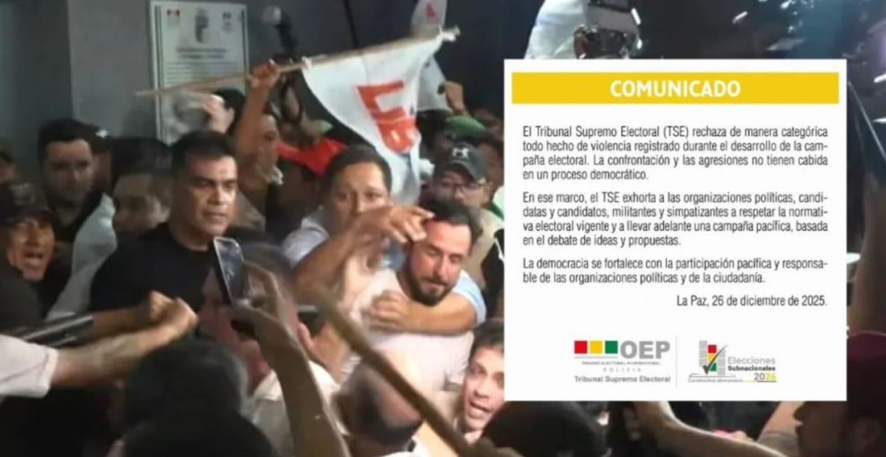 El Tribunal Supremo Electoral (TSE) condenó los actos de violencia registrados en el Tribunal Electoral Departamental (TED) de Santa Cruz durante el cierre del plazo de inscripción de candidaturas, hechos en los que resultaron agredidos Juan Pablo Velasco y Paola Aguirre, postulantes a la Gobernación cruceña por la alianza Libre.