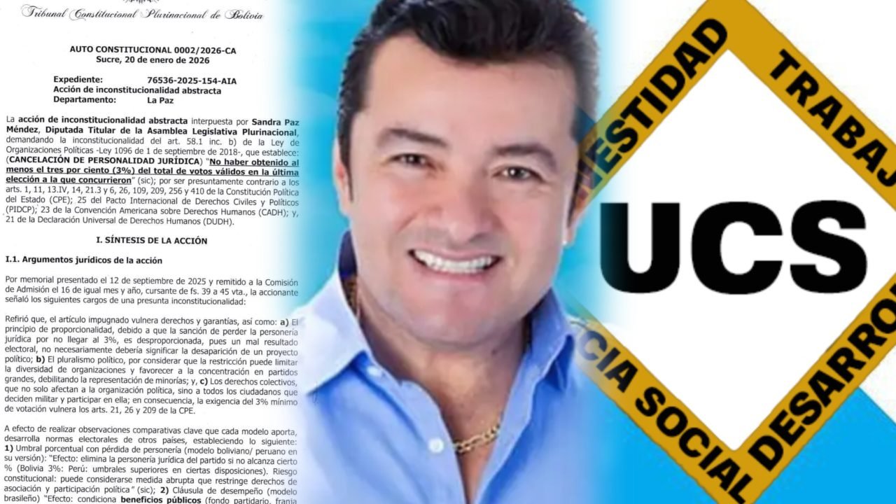 El Tribunal Constitucional Plurinacional (TCP) ratificó la decisión del Tribunal Supremo Electoral (TSE), rechazó la acción de inconstitucionalidad presentada por el partido Unidad Cívica Solidaridad (UCS) y define la cancelación de su personería jurídica.