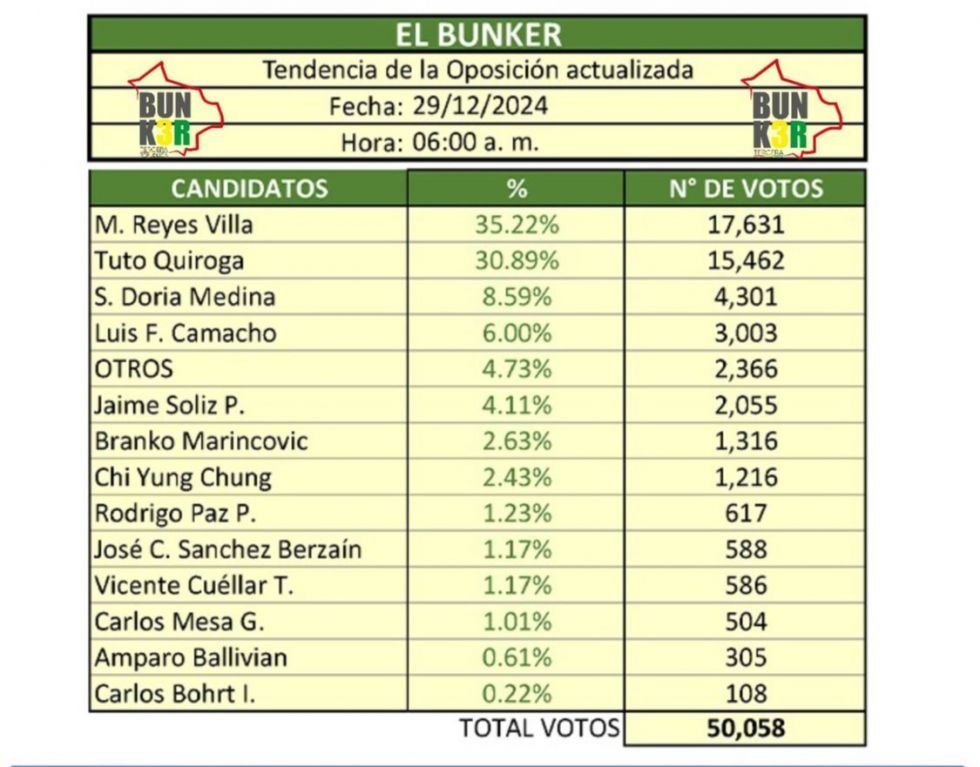 El sondeo, que se realizó entre el 26 y el 28 de diciembre, reveló que Manfred Reyes Villa lidera con el 35,22% (17.631 votos), seguido por Jorge Tuto Quiroga con el 30,89% (15.462 votos). En tercer lugar se posicionó Samuel Doria Medina con el 8,59% (4.301 votos), mientras que Luis Fernando Camacho ocupó el cuarto lugar con el 6% (3.003 votos).
