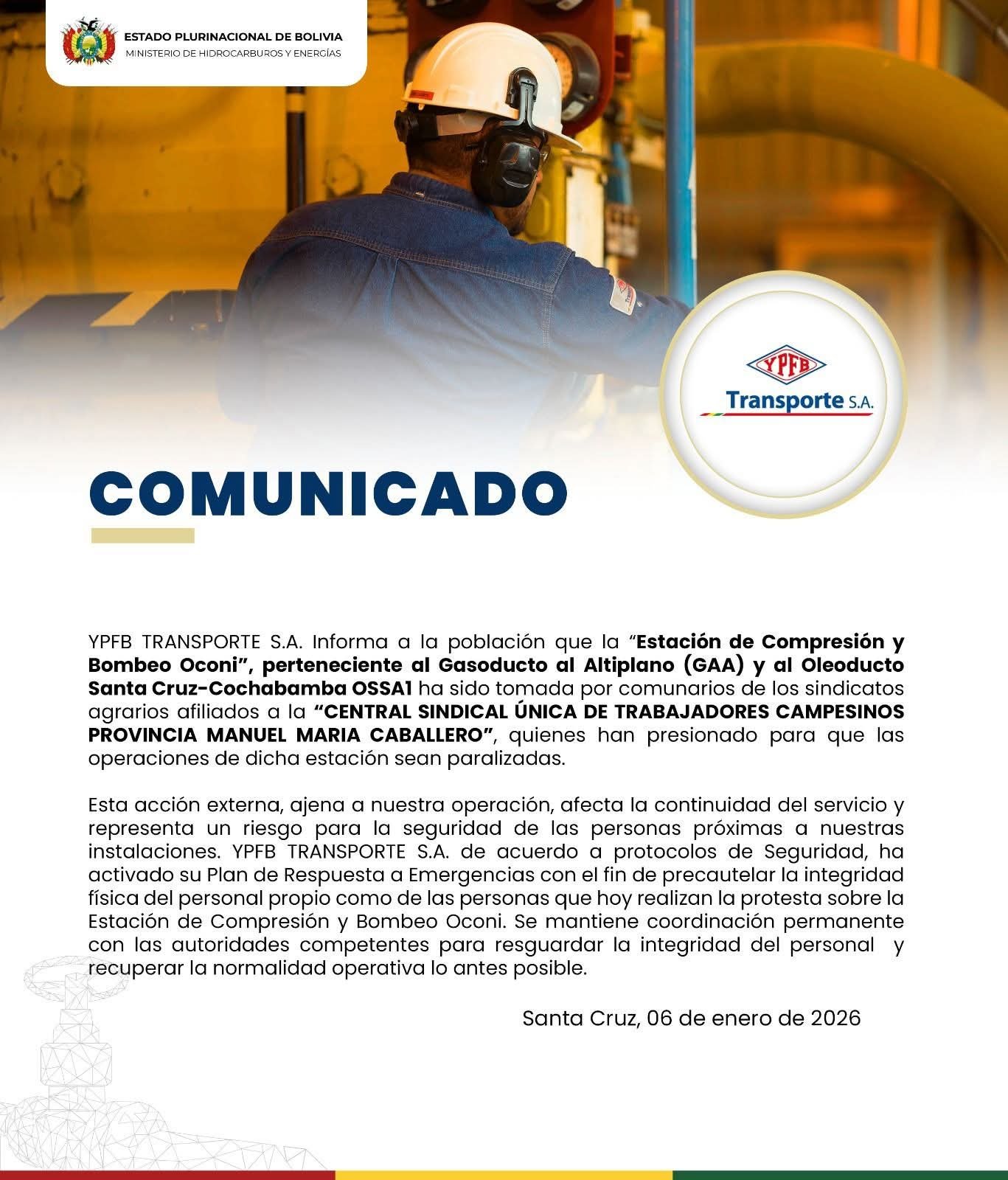 La “Estación de Compresión y Bombeo Oconi”, parte estratégica del Gasoducto al Altiplano y del Oleoducto Santa Cruz-Cochabamba, fue ocupada por comunarios de sindicatos agrarios de la provincia Manuel María Caballero, vinculados a la Central Sindical Única de Trabajadores Campesinos.
